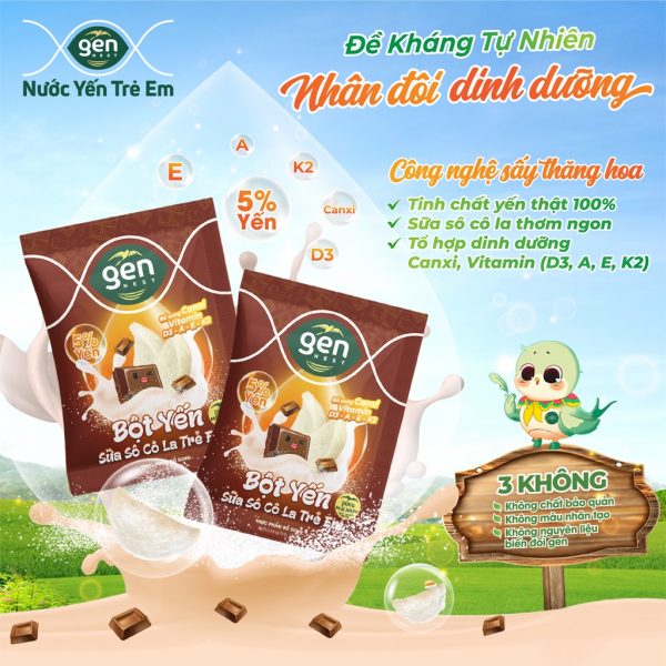 Thành phần tinh chất yến thật 100 % giàu protein, axit amin và các khoáng chất cần thiết cho cơ thể. Kết hợp cùng với socola bổ sung các hợp chất canxi, K2, D3, vitamin A, E giàu dưỡng chấtcho sự phát triển toàn diện của trẻ. Hàm lượng yến 5% phù hợp với việc sử dụng hằng ngày, cùng sợi yến mát bùi, hương vị thơm ngon sẽ mang đến một thức uống giups bổ sung năng lượng và tăng cường đề kháng tự nhiên giúp trẻ vui khỏe, tự do trãi nghiệm và khôn lớn mỗi ngày. HDSD: Lấy một ly hoặc cốc sạch và khô, đảm bảo không có dấu vết bẩn.